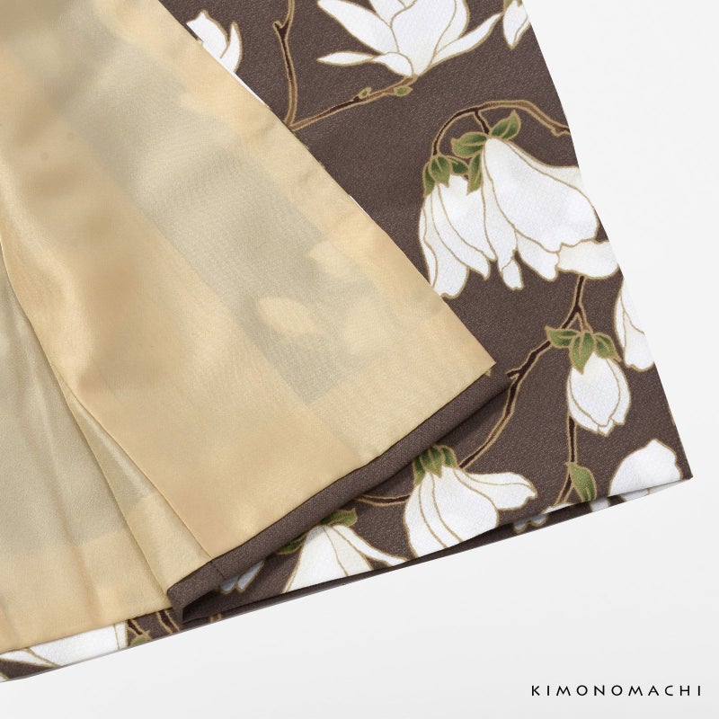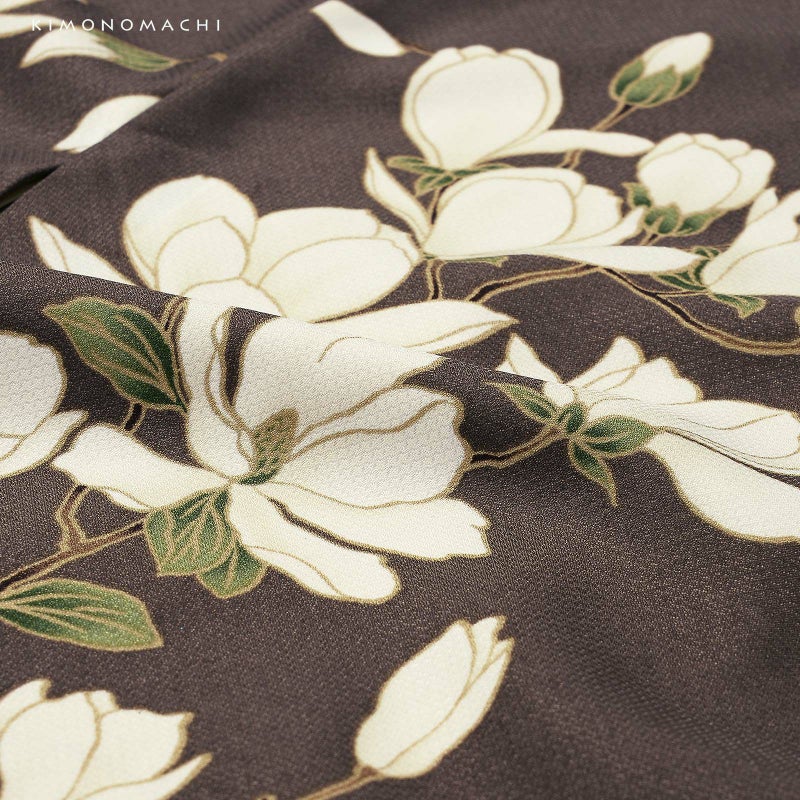 二尺袖着物:ココアのような浅い茶色の地に枝を伸ばした白木蓮。淡いベージュのぼかしが入った白い花にこげ茶の枝、萼や蕊の深い黄緑がポイントです。薄香色の輪郭線が柔らかい印象を添え、咲きこぼれる木蓮の優美な魅力を演出しています。裏地はベージュ。