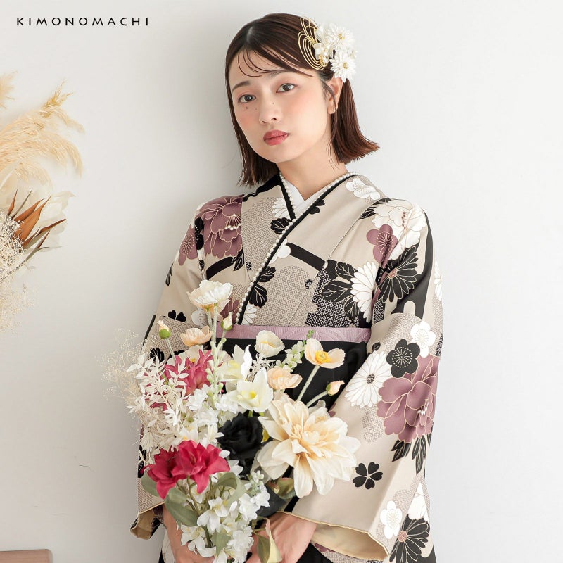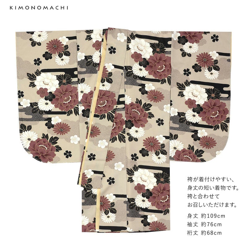 二尺袖着物:浅いグレージュの地に、黒のエ霞、濃いベージュグレーの鹿の子の雲、その上に牡丹を中心とした梅、菊、桜などのさまざまな花紋。鴇浅葱、白、ベージュなどの落ち着いた色を黒で引き締めた配色が和モダンな印象です。裏地はベージュ。