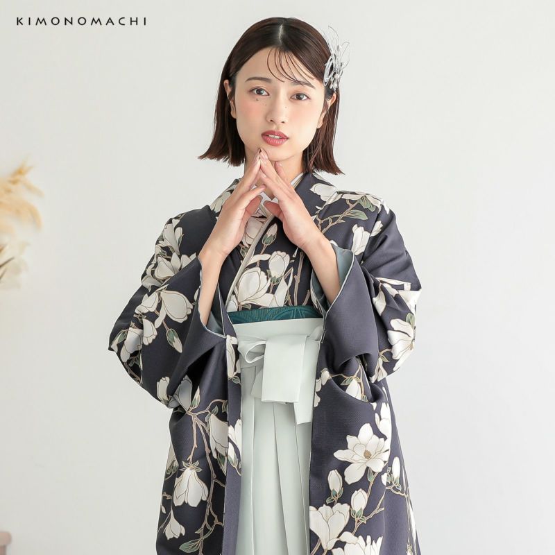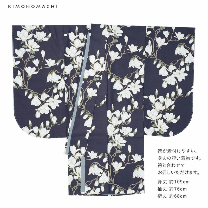 二尺袖着物:グレイッシュな暗めの青紫色の地に枝を伸ばした白木蓮。淡いベージュのぼかしが入った白い花に薄茶の枝、萼や蕊の深い青緑がポイントです。薄香色の輪郭線が花を際立たせ、咲きこぼれる木蓮の清らかな魅力を演出しています。裏地は薄鈍色。