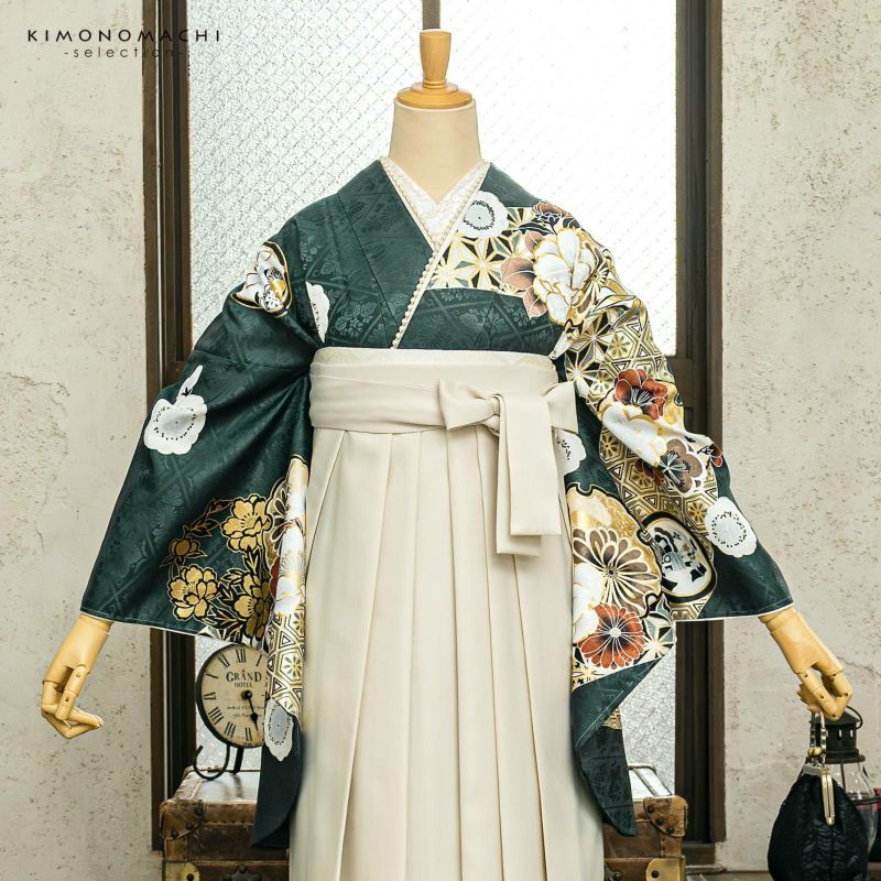京都きもの町厳選コーディネート! 卒業式におすすめの袴スタイル、 二尺袖着物と袴に、 帯と襦袢もついた4点セットです。