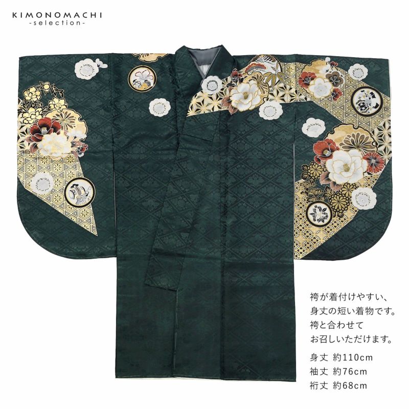 二尺袖着物:菊入り菱の地模様、グレイッシュな鈍い青緑地。ゴールドや黒、白、ブルーグレーで裂取りに亀甲や七宝、麻の葉などの吉祥紋。その上に錆朱や薄茶、淡いグレーのぼかしで椿や梅、菊などの四季花、丸紋が縫い目をまたいで繋がる絵羽になって表現されています。