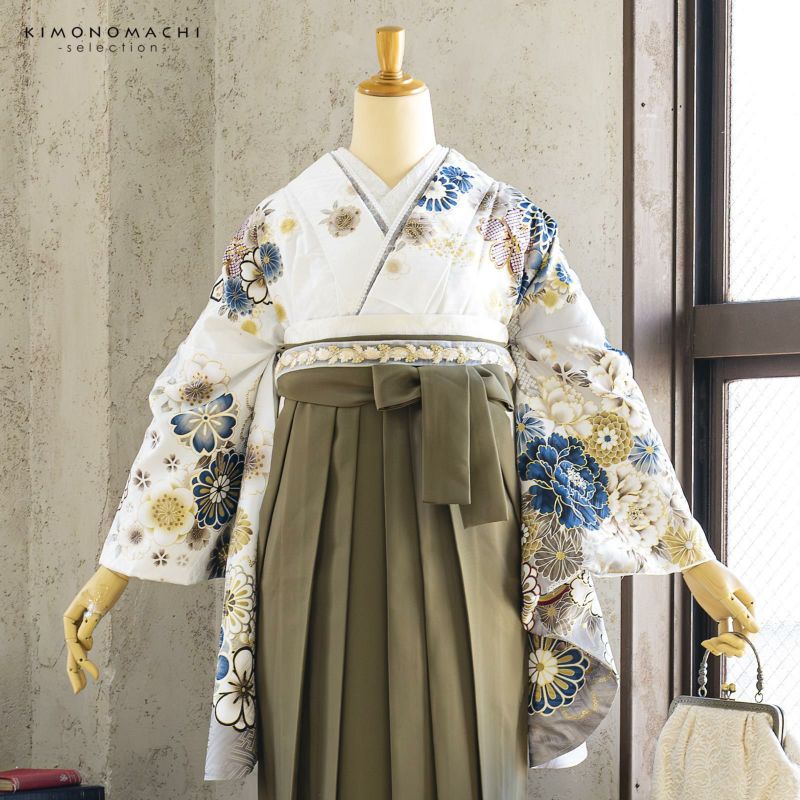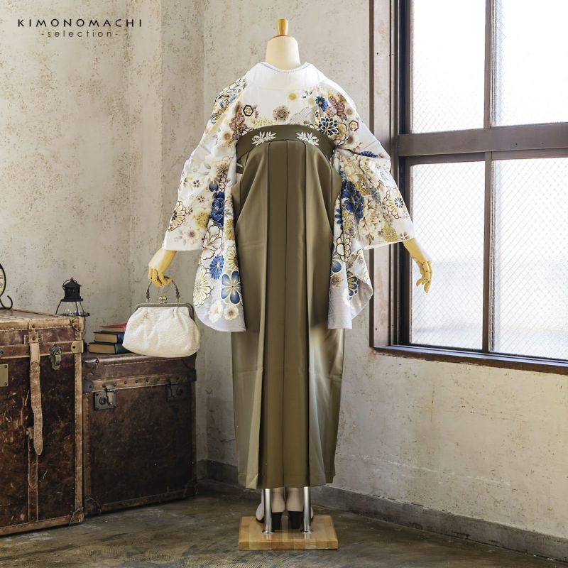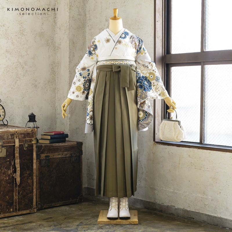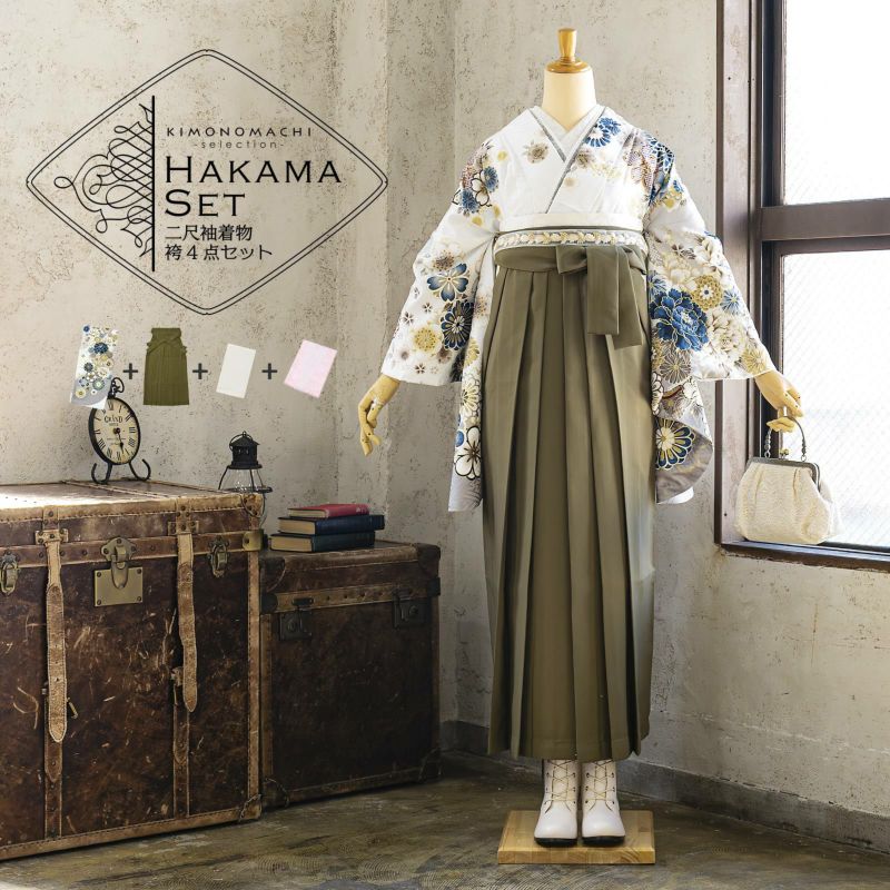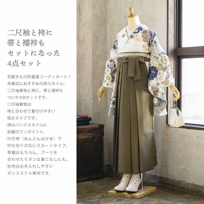 京都きもの町厳選コーディネート! 卒業式におすすめの袴スタイル、 二尺袖着物と袴に、 帯と襦袢もついた4点セットです。