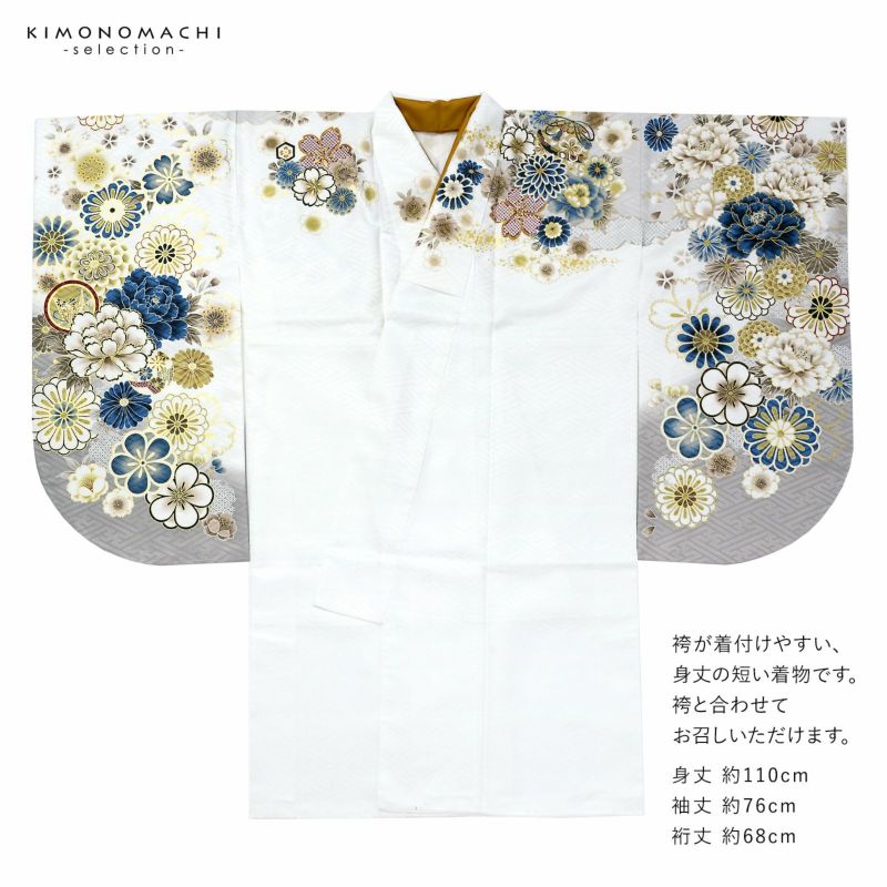 二尺袖着物:紗綾形の地模様の白地。袖にグレーの裾ぼかし。淡いアイスグレーに灰色の鹿の子の雲取り。深い青に白、からし色、淡いチャコールグレーに赤茶や臙脂の牡丹に八重菊、梅、桜、丸紋。ポイントに金彩の縁取りや切箔。文様が縫い目をまたいで繋がる絵羽になって表現されています。からし色の重ね衿。