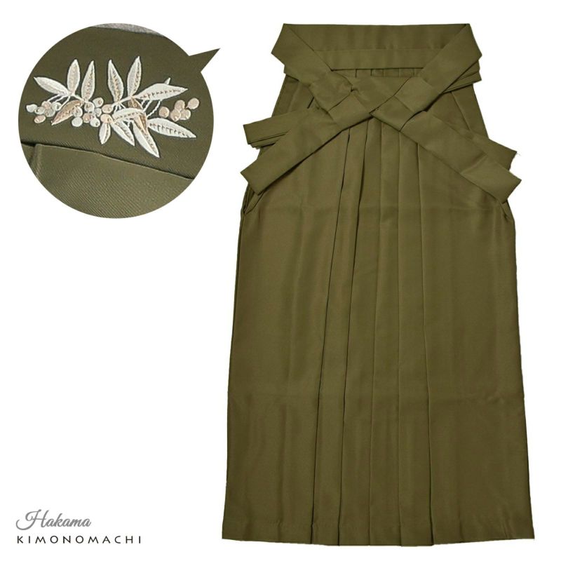 袴:灰みの黄緑色系のオリーブ色の地、腰の後ろ部分にシルバーグレーやグレージュ、ポイントに金糸の入った南天の刺繍。