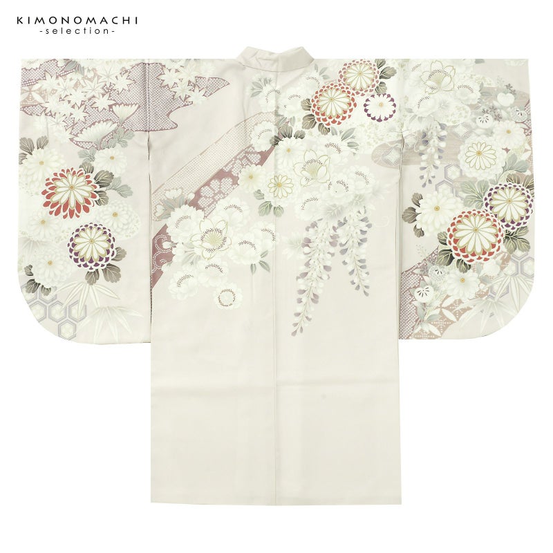 【色柄】ごく淡いグレイッシュなくすみピンクの地に浅い赤紫やピンクベージュの雲取り、藤色の亀甲。白、紫、鈍い赤紫の丸い八重菊に優しい色遣いの八重桜、藤、楓などが縫い目をまたいで繋がる絵羽で表現されています。