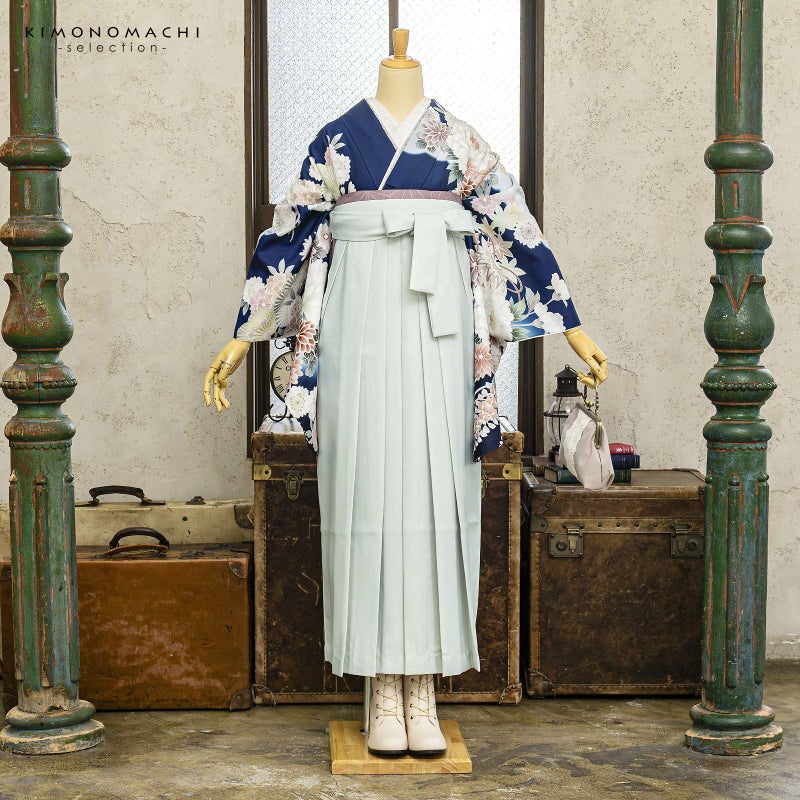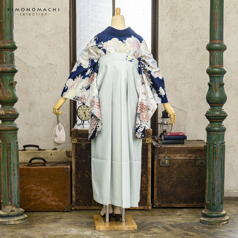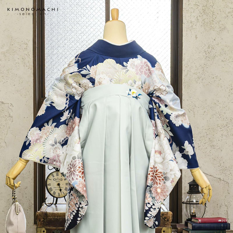 卒業式に 二尺袖袴セット 卒業式 袴 レディース 袴 セット 卒業式 女性 4点セット「二尺袖:紺青 流水に牡丹、四季花、鈴+袴 アイスグレー椿:+袴下帯:ダルパープル 麻の葉+襦袢」SS/S/M/L/LL サイズ 卒業式 女性 レディース お仕立て上がり 袴セット 二尺袖着物セット 着物 二尺着物 袴【メール便不可】