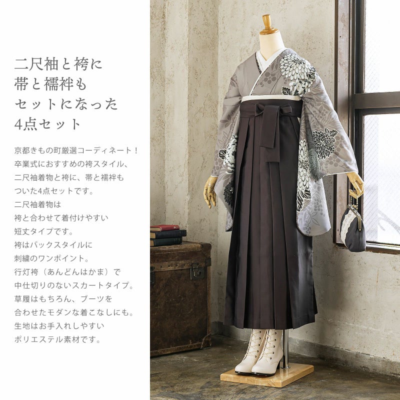 京都きもの町厳選コーディネート!卒業式におすすめのスタイル、二尺袖着物と袴に、帯と襦袢もついた4点セットです。