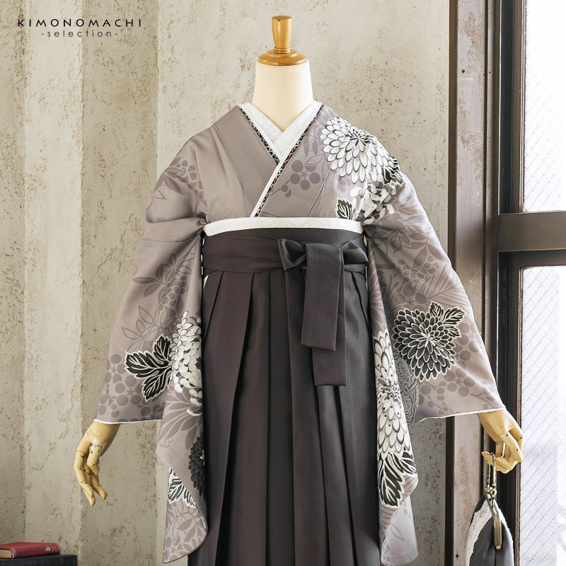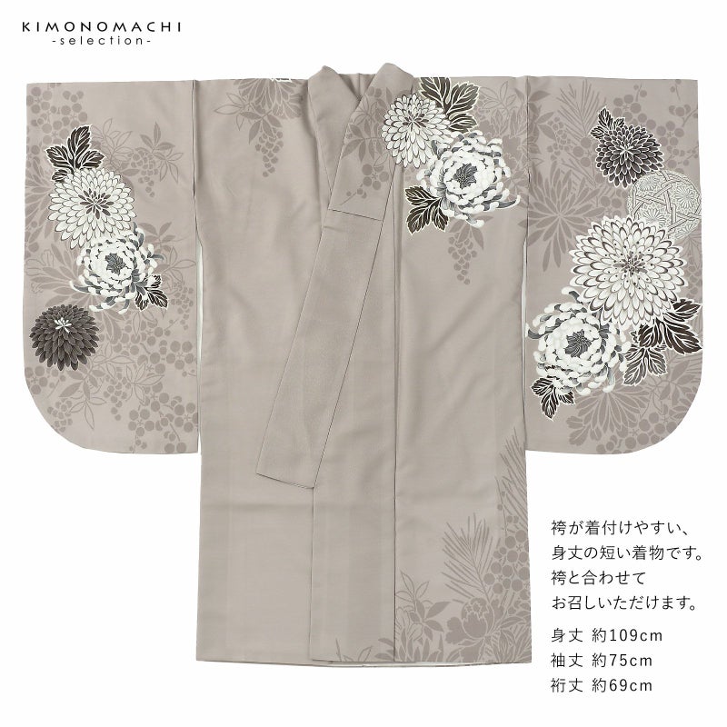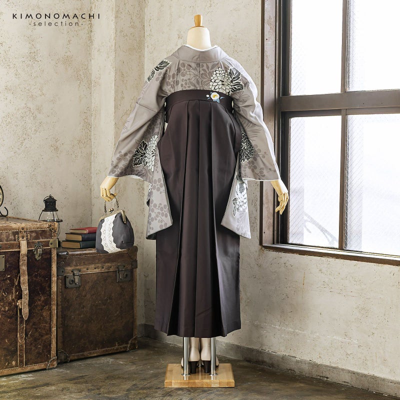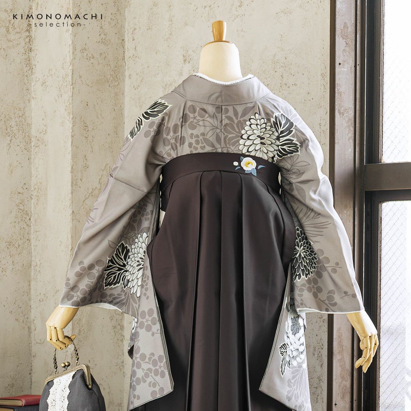 卒業式に 二尺袖袴セット 卒業式 袴 レディース 袴 セット 卒業式 女性 4点セット「二尺袖:グレージュ 八重菊に手鞠+袴:アンティークブラウン 椿+袴下帯:麻の葉 白+襦袢」SS/S/M/L/LL サイズ 卒業式 女性 レディース お仕立て上がり 袴セット 二尺袖着物セット 着物 二尺着物 袴【メール便不可】