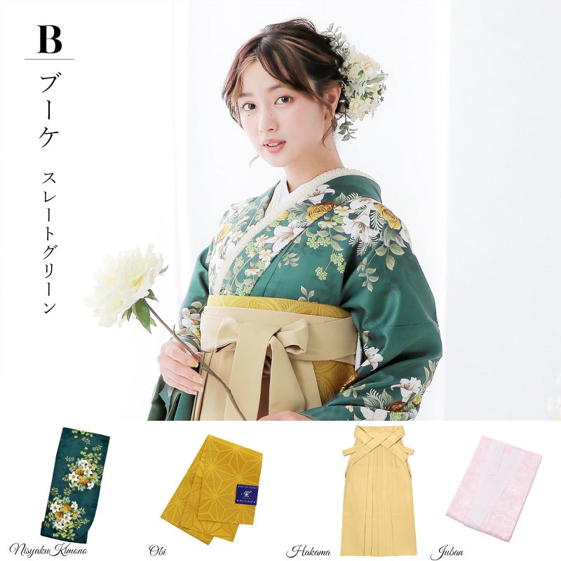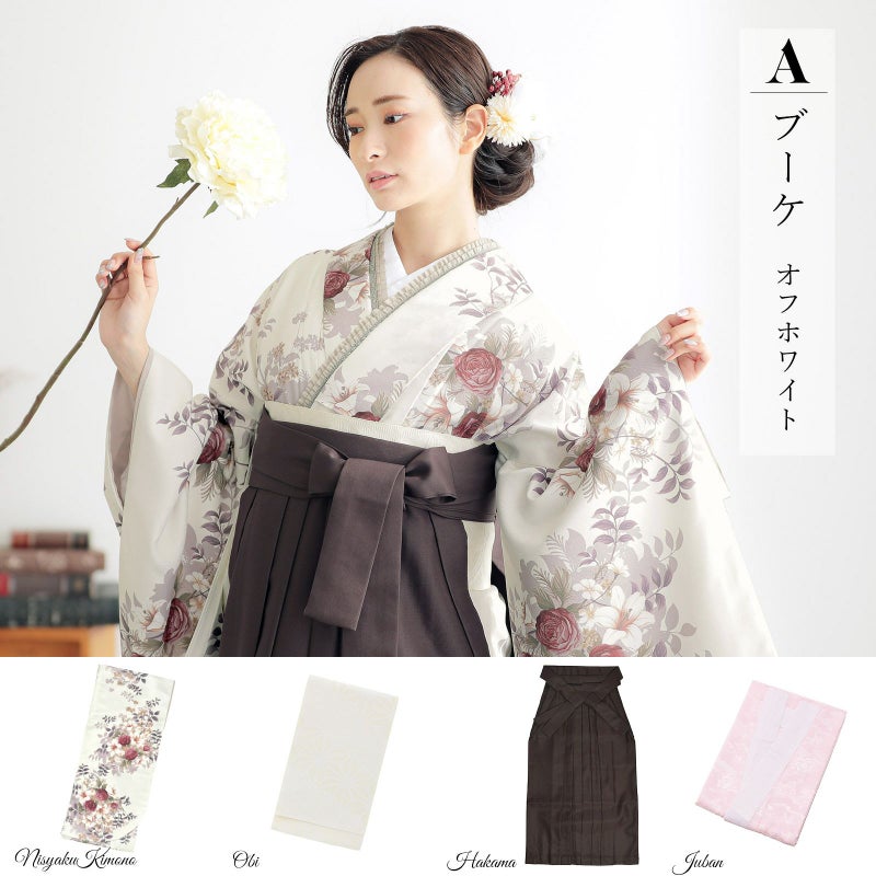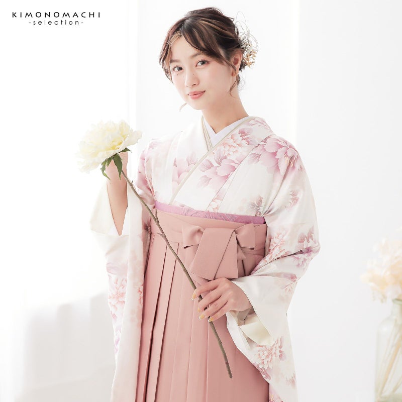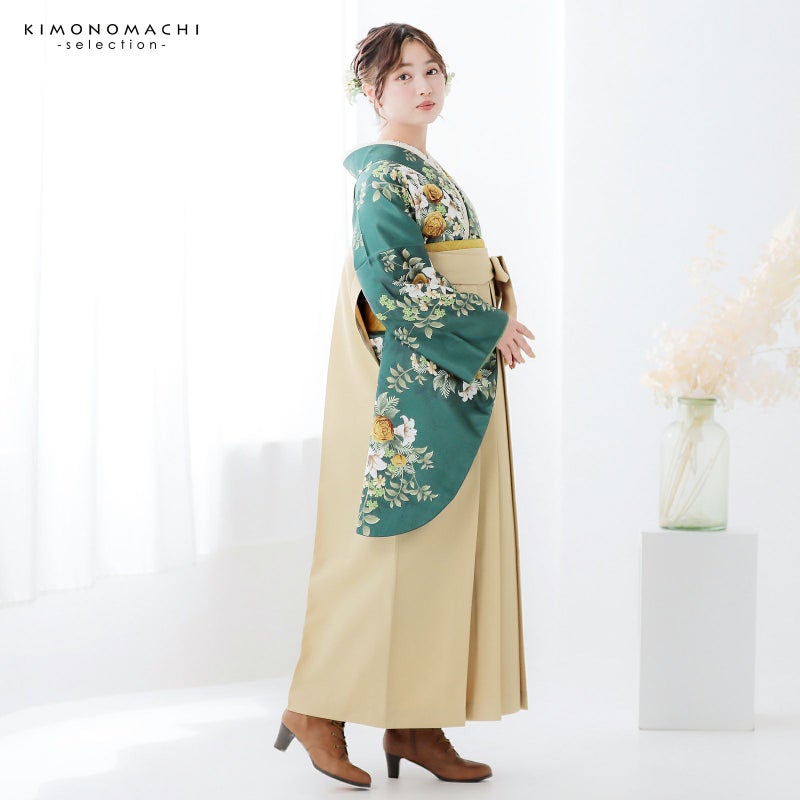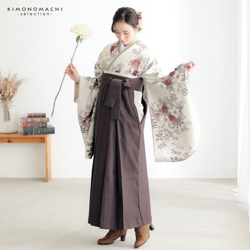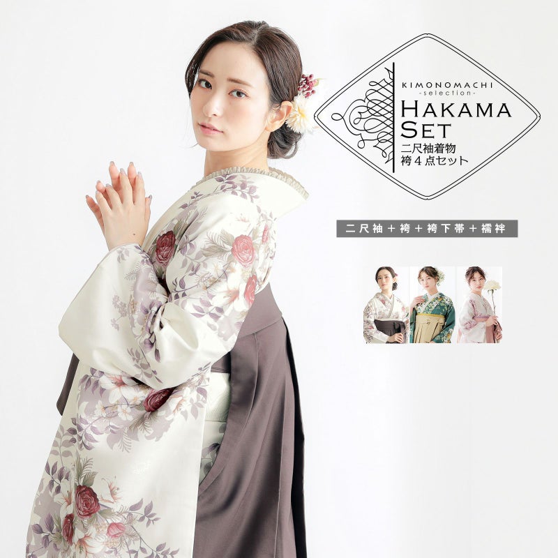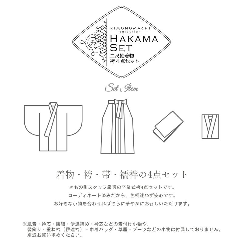 京都きもの町厳選コーディネート!卒業式におすすめの袴スタイル、二尺袖着物と袴に、帯と補袢もついた4点セットです。