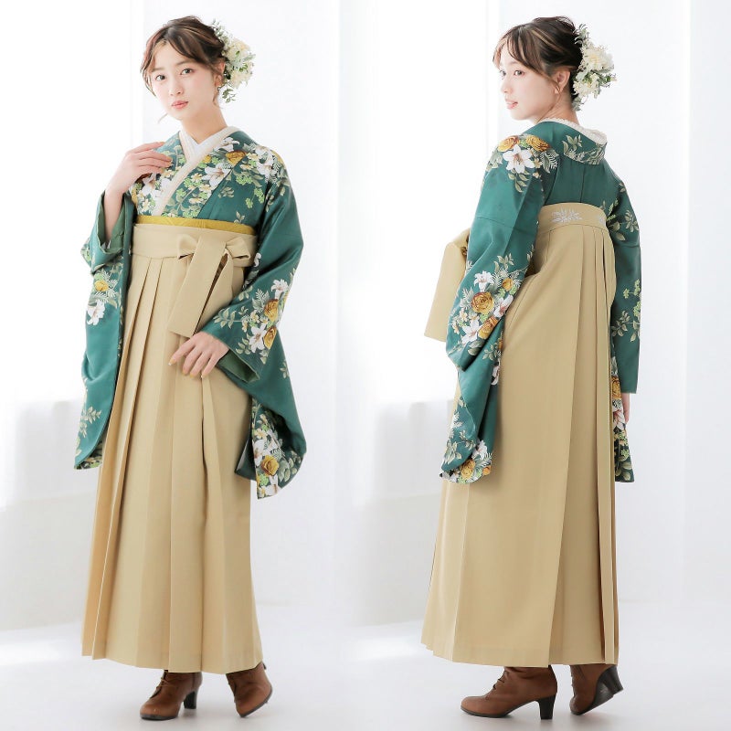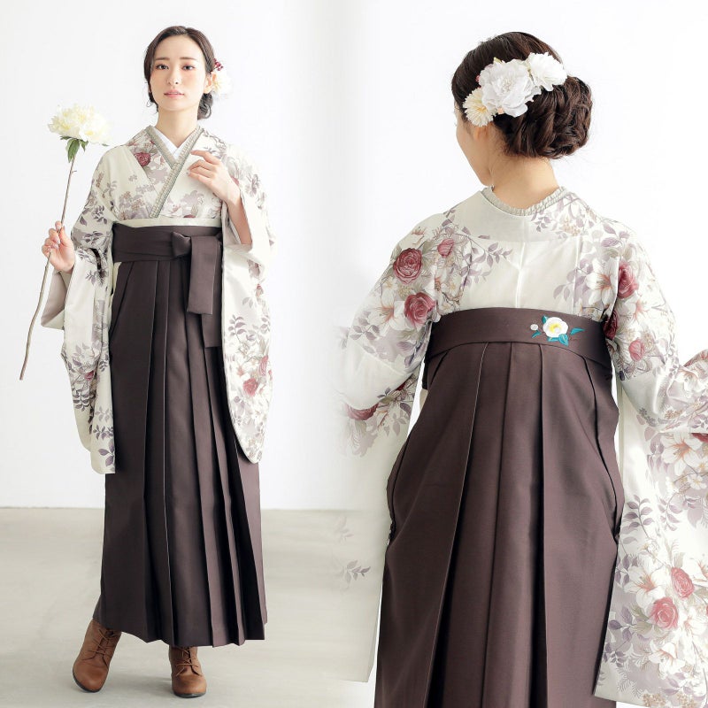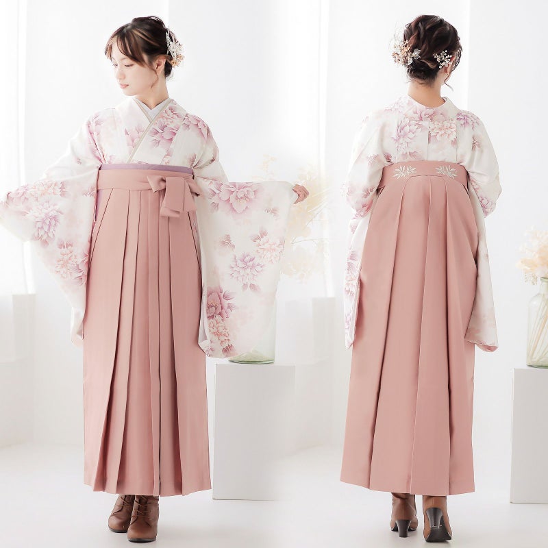 二尺袖着物は袴と合わせて着付けやすい短丈タイプです。袴はバックスタイルに刺繍のワンポイント。行灯袴(あんどんはかま)で中仕切りのないスカートタイプ。