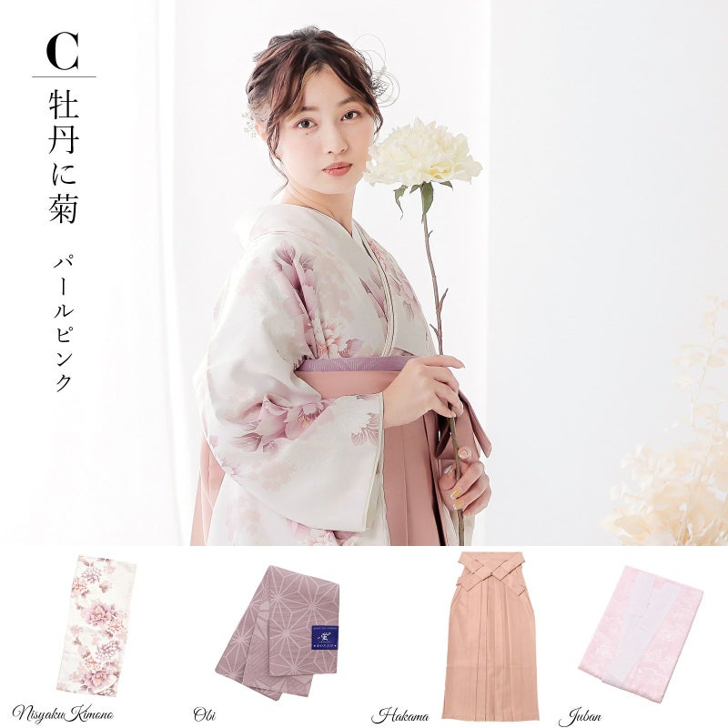 二尺袖着物:紗綾形に花の地模様の生地。ごく淡い薄ピンクの地に、淡い赤紫や灰みの紅藤色の牡丹、白にペールオレンジぼかしの菊の花。くすみピンクのシルエット。br> 袴:やや灰みのローズ系のピンク色の地、腰の後ろ部分にシルバーグレーやグレージュ、ポイントに金糸の入った南天の刺繍。
