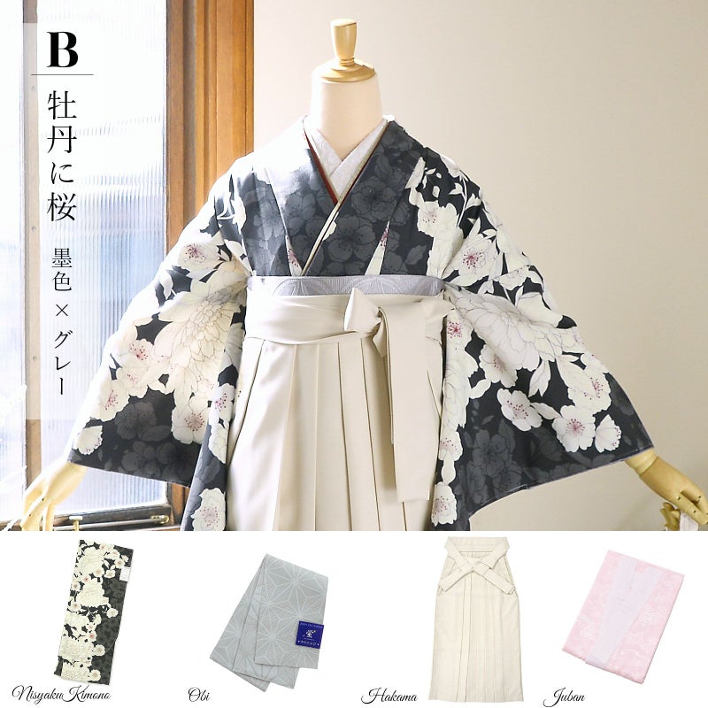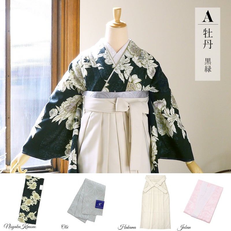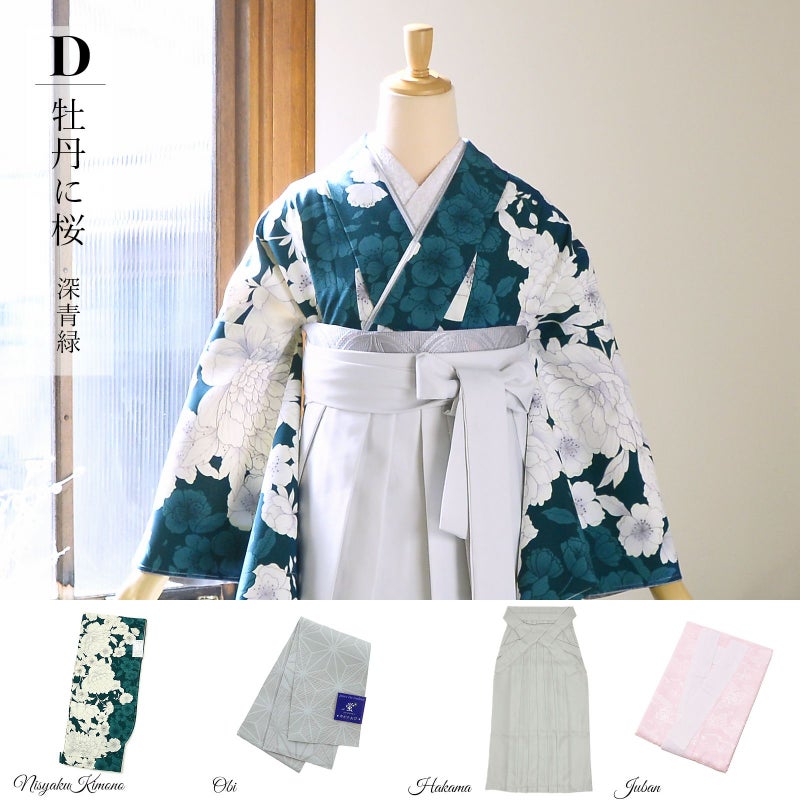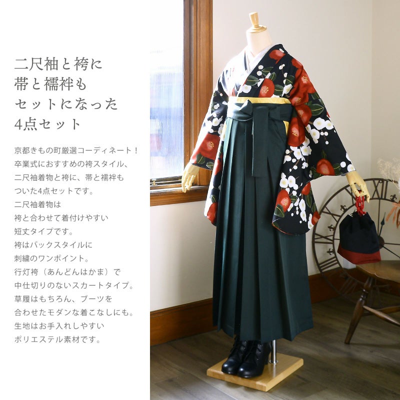 京都きもの町厳選コーディネート! 卒業式におすすめの袴スタイル、 二尺袖着物と袴に、 帯と襦袢もついた4点セットです。
