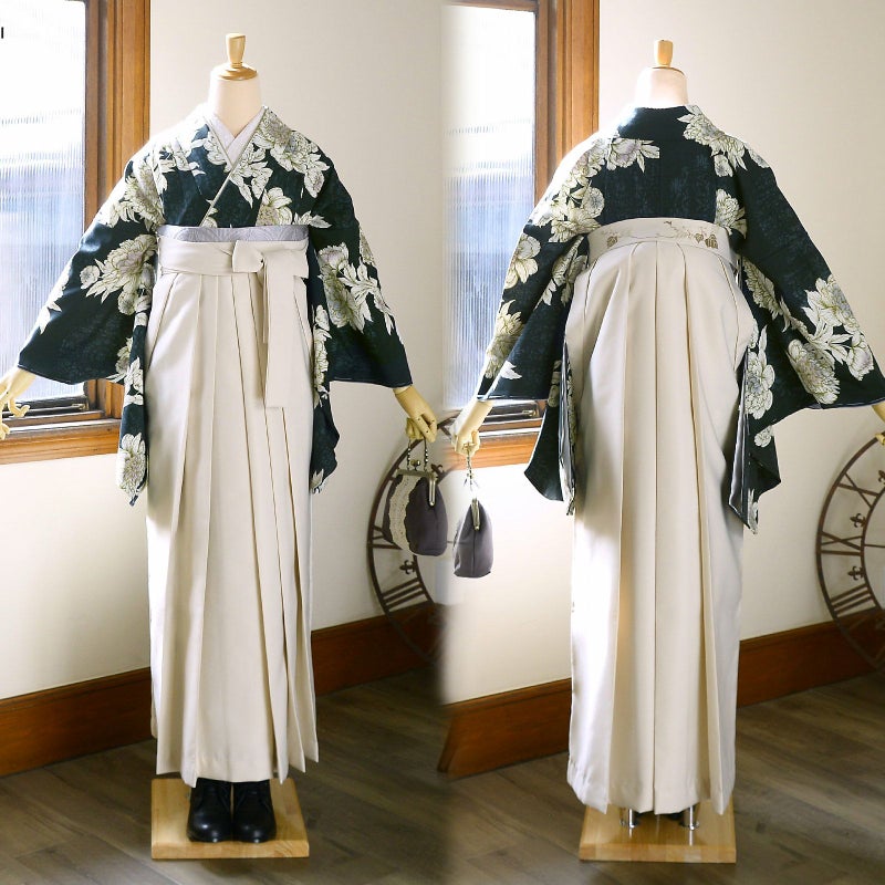 袴:やや暗い深緑色の地、腰の後ろ部分にシルバーグレーやグレージュ、ポイントに金糸の入った南天の刺繍。