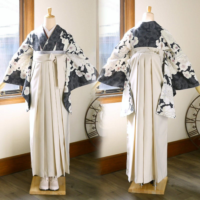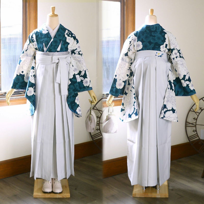 袴:アイスグレー地、腰の部分に白の椿の刺繍