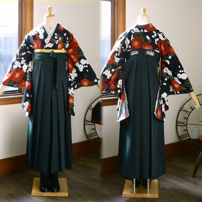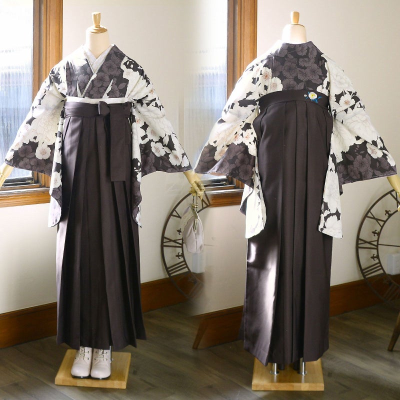 袴:茶色地、腰の部分に白の椿の刺繍