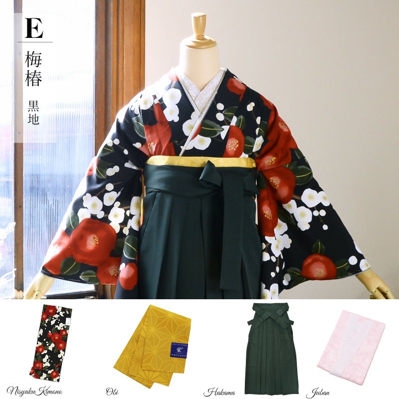 二尺袖着物:黒地に輪郭線のない柔らかいデザインの白梅に紅椿、濃い緑の葉。ベージュやピンクの控えめなぼかし。ポイントに金彩。