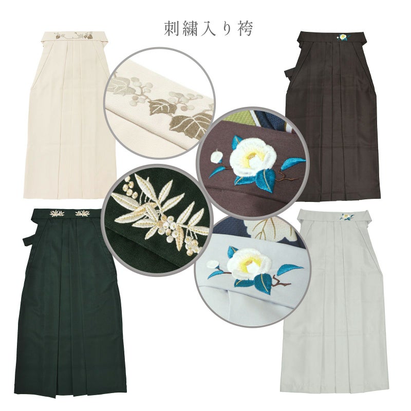 袴はバックスタイルに刺繍のワンポイント。行灯袴(あんどんはかま)で中仕切りのないスカートタイプ。