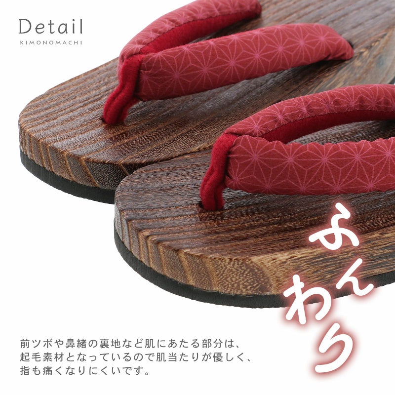 【色柄】鼻緒は鈍めの赤の地に麻の葉模様、鼻緒の裏は赤。前坪も赤。台は焼桐の焦げ茶色。
