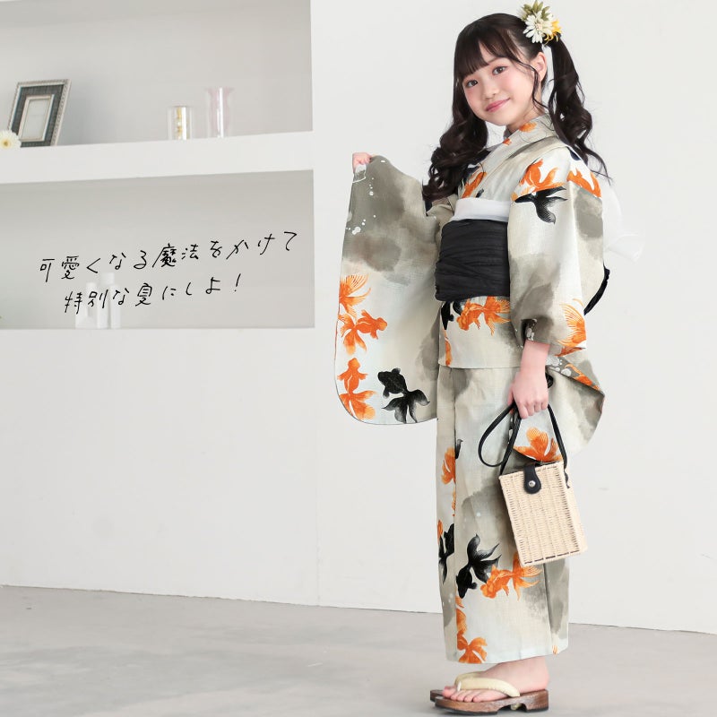 浴衣:生成り色と薄墨色の水彩調のぼかしの地に白のあぶく。朱色と黒の出目金がゆらゆらと泳いでいる姿を上から眺めているかのようなデザインです。