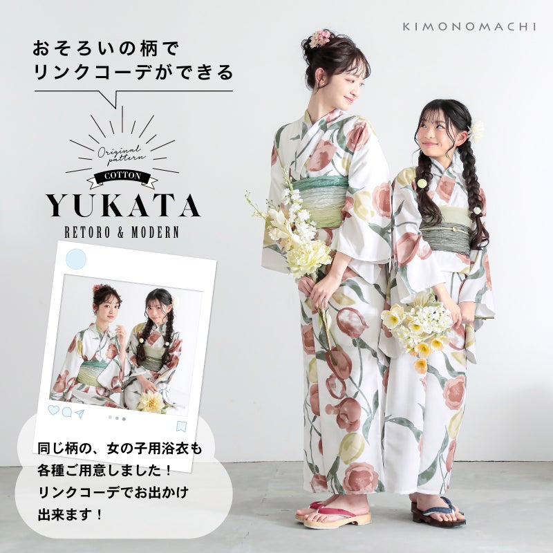 浴衣:オフホワイトの地に濃淡のあるくすんだ紅色と浅い黄色のチューリップの花、浅い緑の葉。手描き調の丸みのある花の形、伸びやかな葉や茎が大人かわいい雰囲気です。