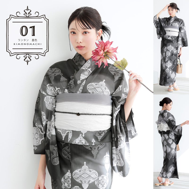浴衣:浅い墨黒にアイビーグレーのぼかしの地。白、グレーの配色で表現されたモザイクガラス風の装飾ランタン。明かりが浮かび上がり、また影に沈む幻想的な雰囲気のデザインです。