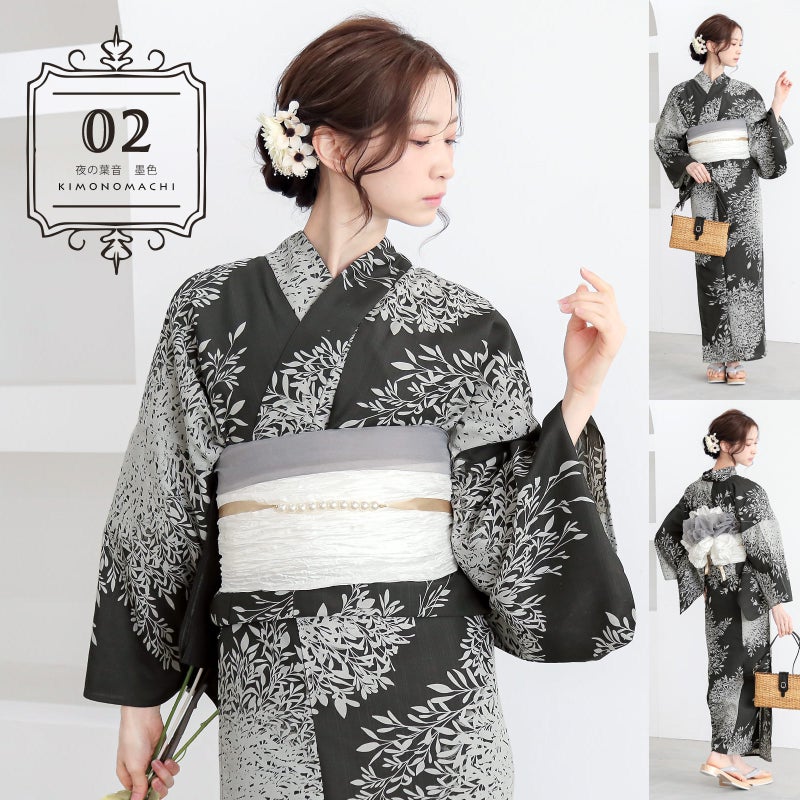 浴衣:浅い墨黒の地にアイビーグレーのシルエットで表現された丸く広がる細葉の茂み。夜風にざわめく葉擦れの音が聞こえてきそうな精緻なデザインです。