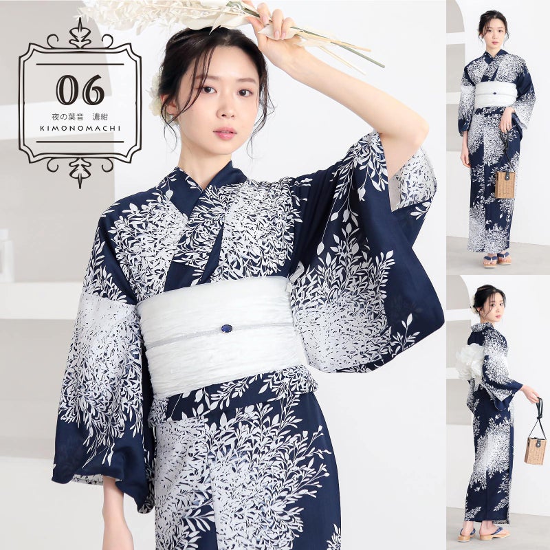 浴衣:濃紺の地に白のシルエットで表現された丸く広がる細葉の茂み。夜風にざわめく葉擦れの音が聞こえてきそうな精緻なデザインです。