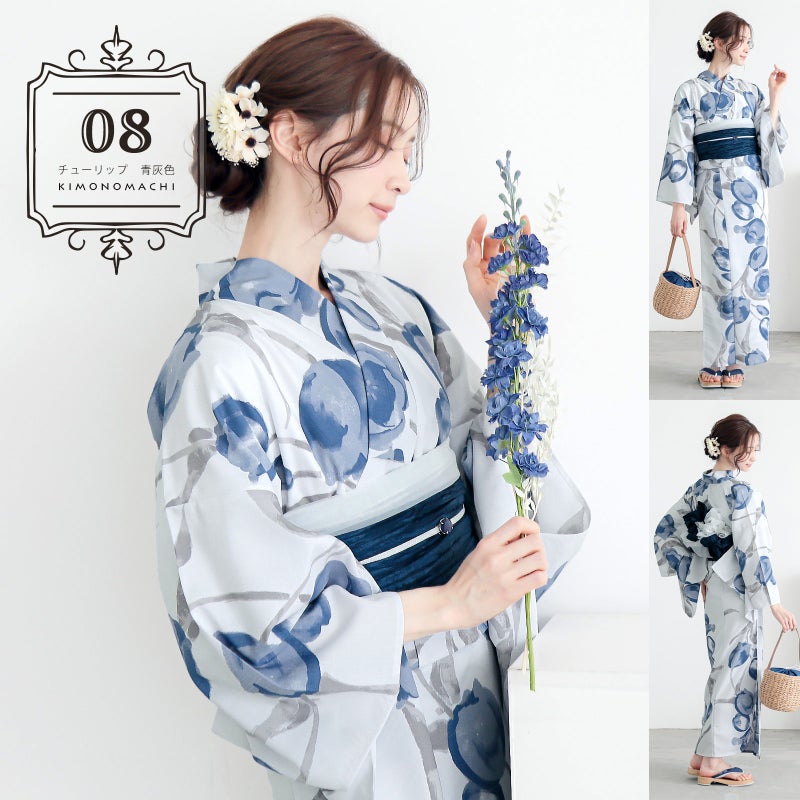 浴衣:わずかにグレイッシュな白地に濃淡のあるくすんだブルーのチューリップの花、薄いグレーの葉。手描き調の丸みのある花の形、伸びやかな葉や茎をクールな配色でまとめました。
