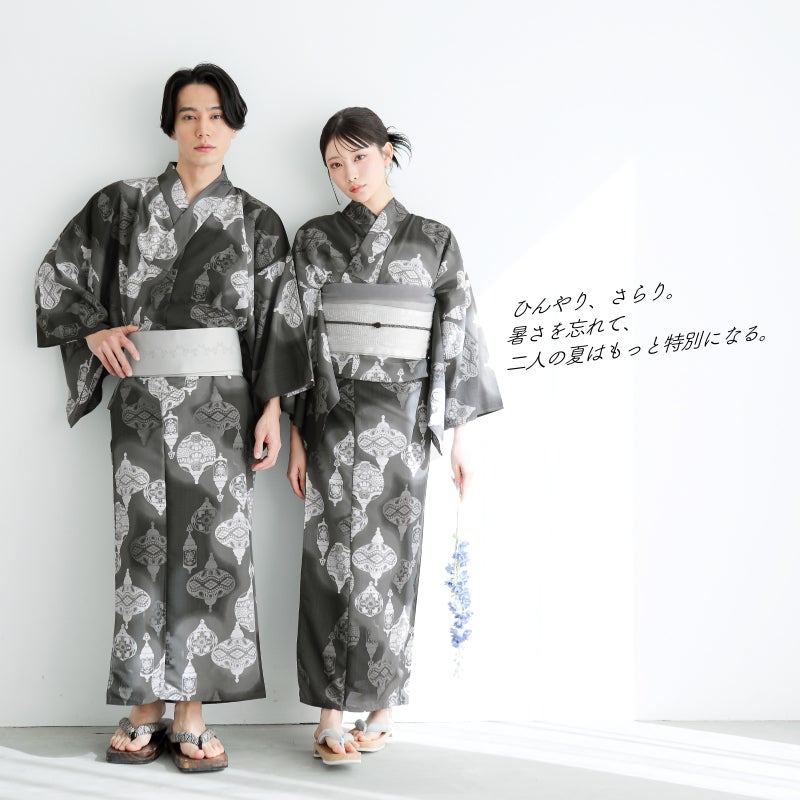 浴衣:浅い墨黒にアイビーグレーのぼかしの地。白、グレーの配色で表現されたモザイクガラス風の装飾ランタン。明かりが浮かび上がり、また影に沈む幻想的な雰囲気のデザインです。
