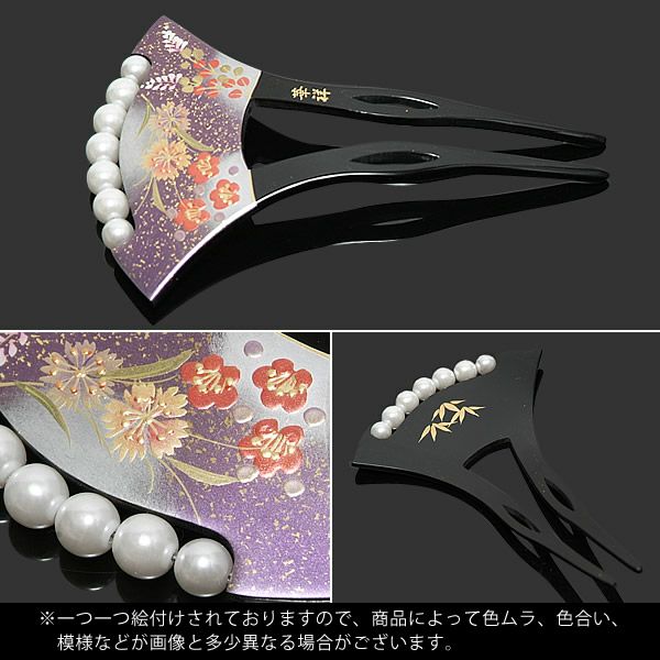 【Prices down2】礼装かんざし「黒台 青紫ぼかし 撫子、萩、梅」バチ型かんざし 蒔絵風 訪問着、色留袖に パールビーズ付 (1467)【メール便不可】<H>ss2509wkk15