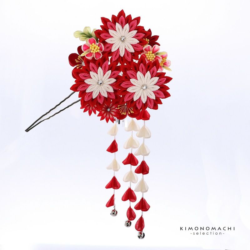 4. 【Prices down5】つまみ細工髪飾り 「赤色×赤ピンク つまみのお花、房飾り」 成人式 卒業式 振袖 簪 前撮り ヘアアクセサリー【メール便不可】ss2512wkk40