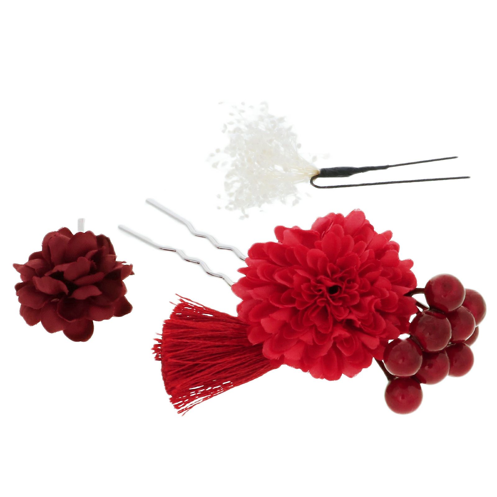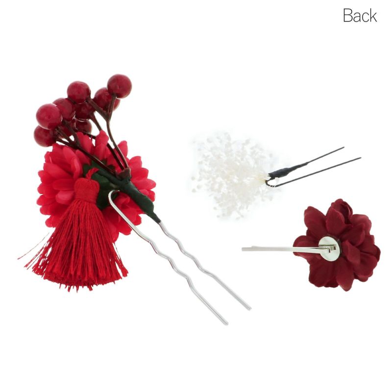 【カラー】明るい赤のポンポンのようなお花に赤い実、赤や緑のタッセルのミニかんざし、細かな白花のUピン、ワインレッドのお花のヘアピンの3点セットです。洋風アレンジにも◎