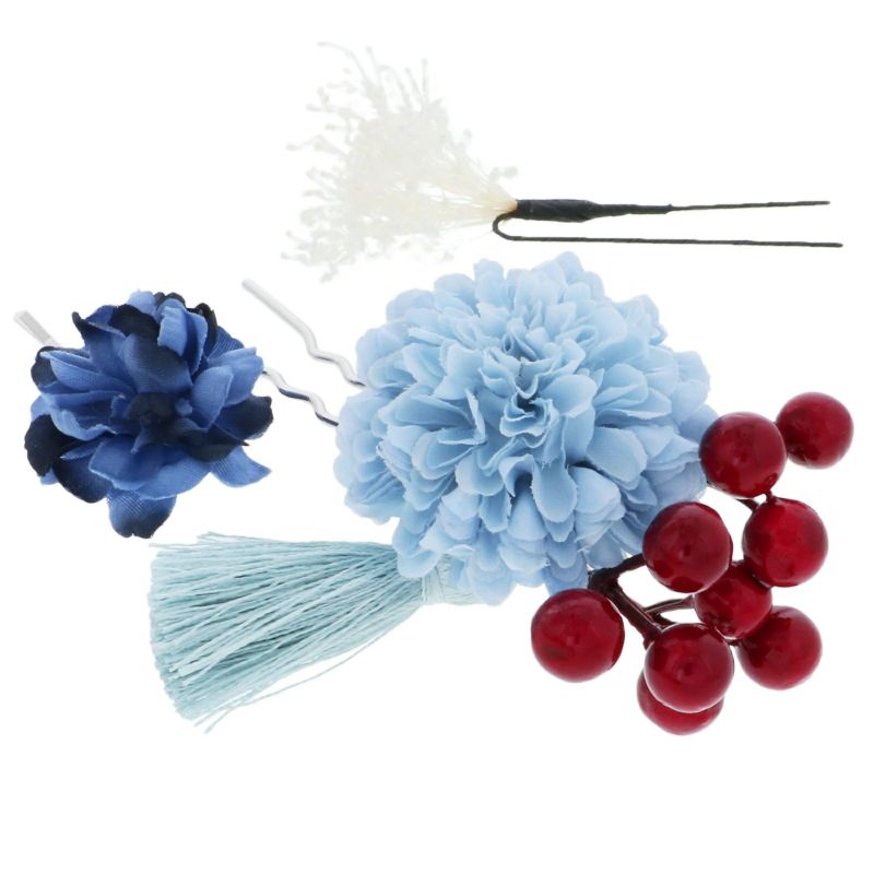 【カラー】淡い空色のポンポンのようなお花に赤い実、ブルーグレーのタッセルのミニかんざし、細かな白花のUピン、ブルーとネイビーのお花のヘアピンの3点セットです。洋風アレンジにも◎