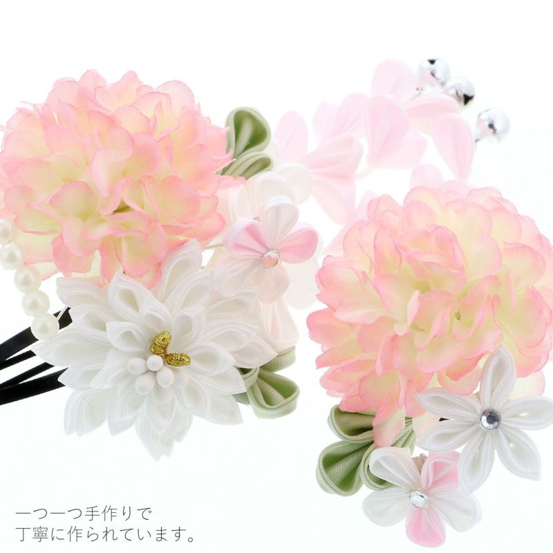 【カラー】淡いクリーム色にピンクぼかしのふんわりとした造花、つまみのお花を組み合わせたピン。つまみの花は白に薄ピンク、淡い緑の葉。クリアなラインストーン、白色のパールビーズ。房は白と薄ピンク。