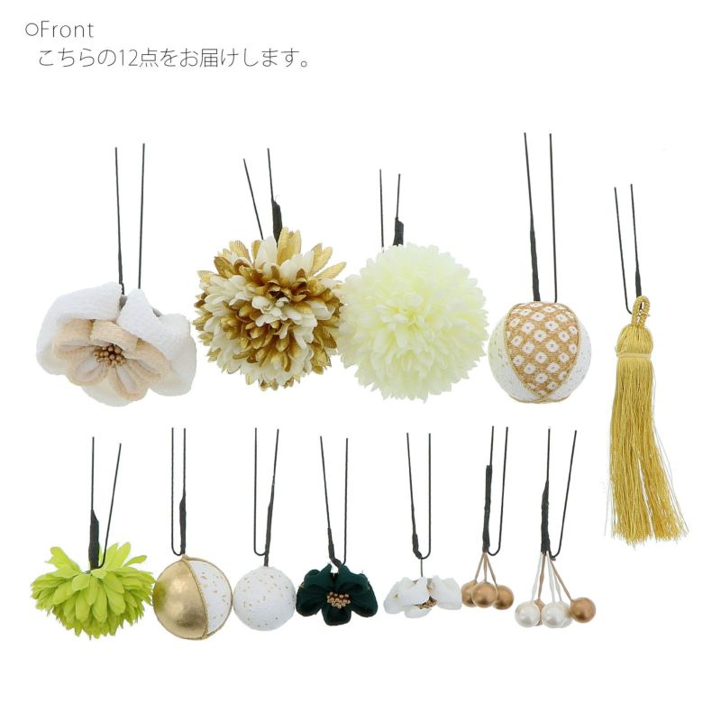 【カラー】つまみのお花・大は白にベージュ、ブロンズの花芯、小は深い緑と白が1点ずつ。ポンポンマムのような造花は、淡いクリーム色、クリーム色と金、黄緑色が各1点。玉飾りの大は白に金の鹿の子にラメ模様、中は白地に金とゴールド、小は白地に金のラメ。ビーズ飾りはパールとブロンズを組み合わせたもの、ブロンズビーズが1点ずつ。明るい金色のタッセル飾り。
