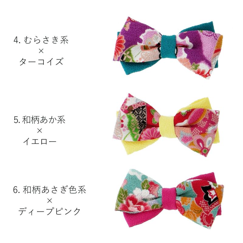 5和柄赤系×イエロー…赤や深いピンク色を基調に黒や緑などの配色の和風の柄のリボンと、明るいクリームイエローのリボンを重ねたクリップ。