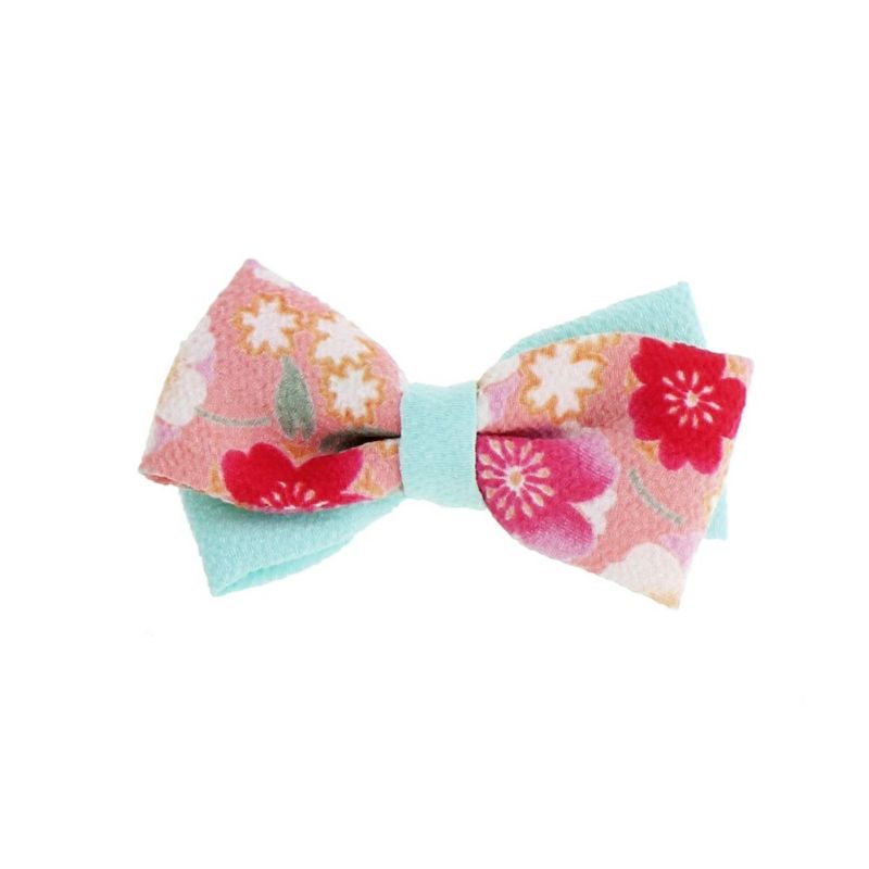 1桜ピンク系×ミントブルー…桃色の地に赤やピンクの桜の花柄リボンと、ミント系の水色のリボンを重ねたクリップ。