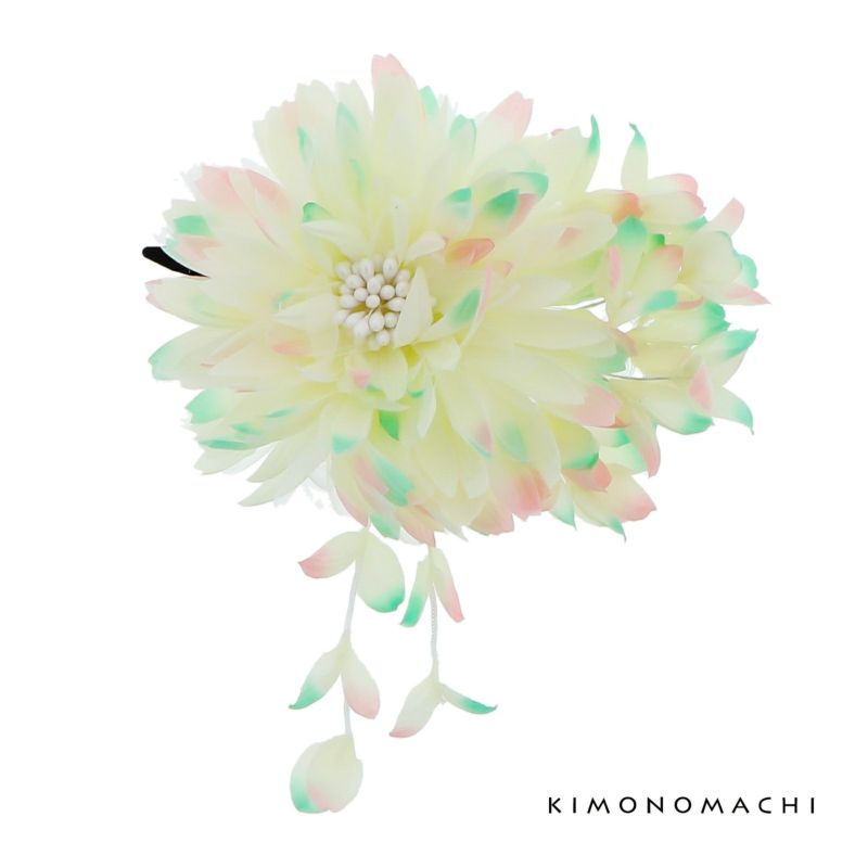 爽やかな色合いのお花に下がり飾りがかわいいお花髪飾りです。