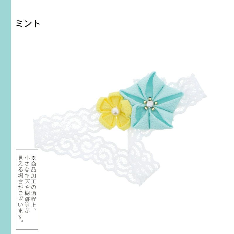 お宮参りやお食い初め、初節句などのお子様の成長のお祝いに、また、お正月や結婚式での装いに、お着物や袴姿の和の装いにぴったりなつまみ細工とストレッチレースのヘアバンド髪飾りです。