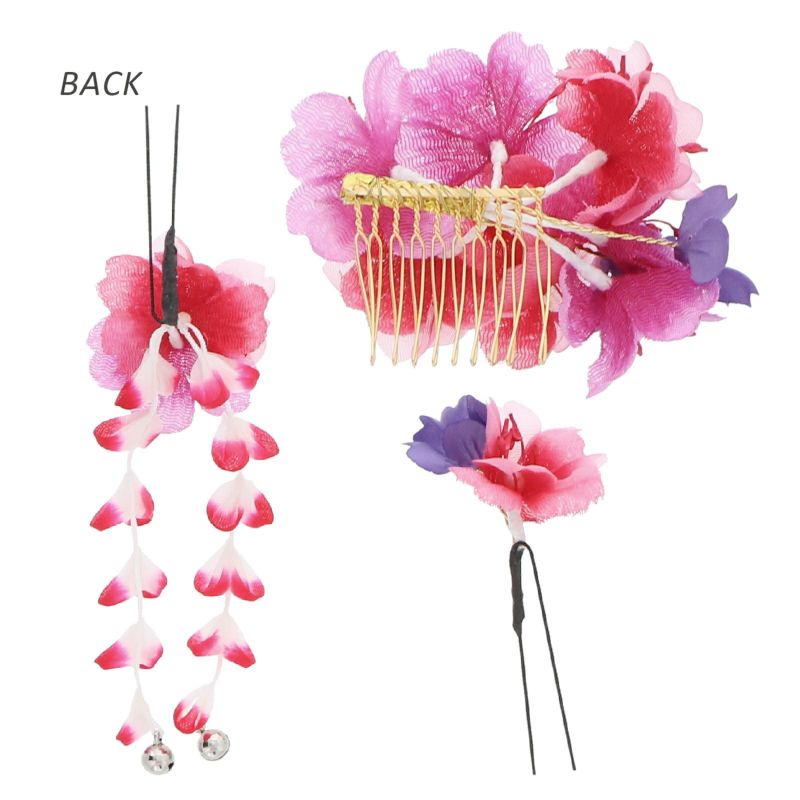 お花のコームとUピンの髪飾り3点セットです。振袖などの華やかなお着物に合わせて、成人式、七五三などの晴れやかな席に。