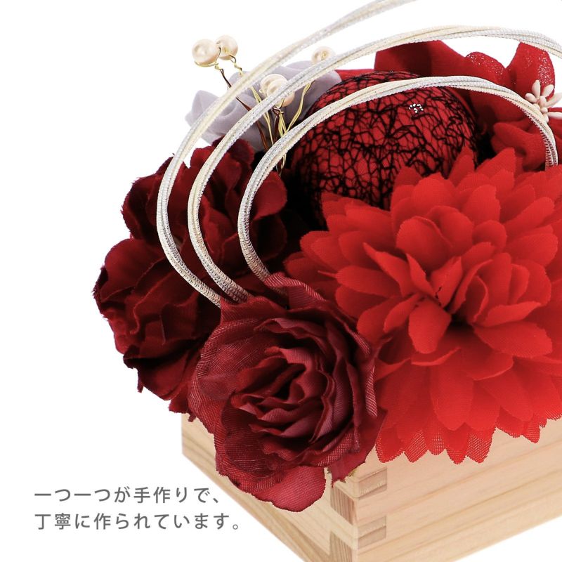 こちらの髪飾りは、Uピン仕様のセットで装着も簡単。ショートヘアからロングヘアまで、髪型を気にせずにお使いいただけます。ヘアスタイルに合わせて、髪飾りのボリュームが調整できます。また、お好みの位置に分けてアレンジが可能です。「祝枡(祝います)」という縁起がよい枡にアレンジしてお届けいたします。