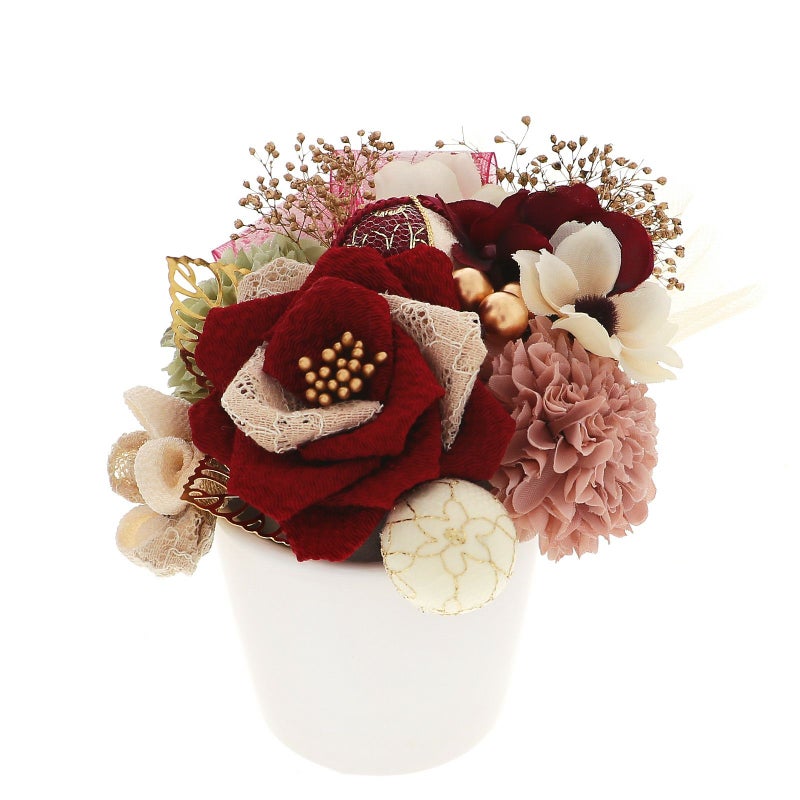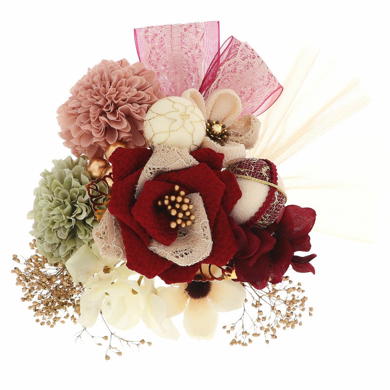 レッド:深い赤の縮緬にベージュのレースの花びらの薔薇が1点、淡い灰緑色とくすみピンクのマム各1点、ベージュの縮緬とレースの丸つまみのお花1点、アイボリーにゴールドのチュールを重ねた玉飾り小1点、アイボリーとワイン、チュールを組み合わせた玉飾り中1点、深いワインレッドとオフホワイトのアジサイ各1点、アイボリーの小花、ゴールドのリーフ、カスミソウ、ブロンズのビーズ飾り、ベージュのチュール、ワインレッドに白レースのリボン飾り。