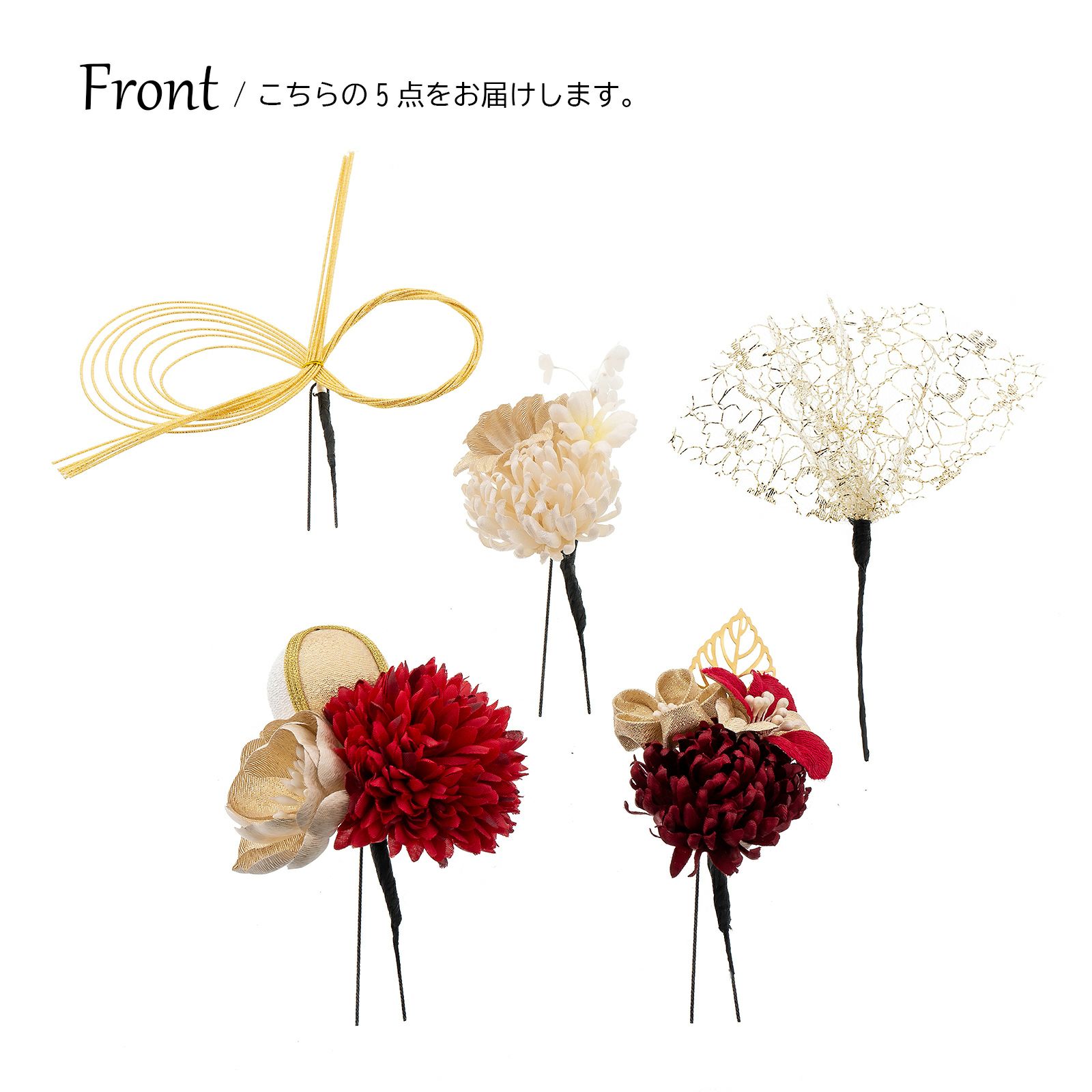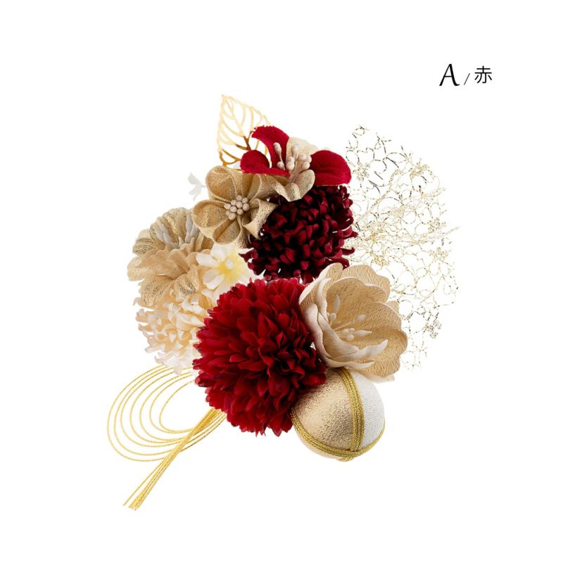 A.赤:深い赤の大マム、ゴールドのお花、ゴールド×白の玉飾りを組み合わせたUピン1点。深い赤の小マム、ゴールドのつまみのお花、赤×ゴールドのお花、ゴールドのメタルリーフのUピン1点。淡いベージュの小マム、ゴールドのお花、白の小花のUピン1点。ゴールドの八の字水引飾りのUピン1点。ゴールドのチュールレースのUピン1点。