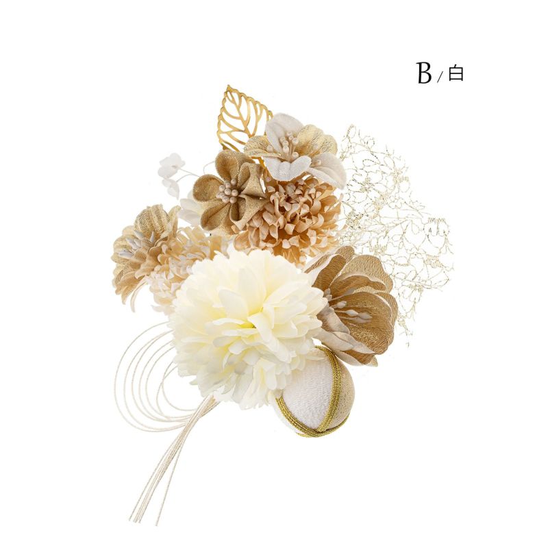 B.白:淡いクリーム色の大マム、ゴールドのお花、ゴールド×白の玉飾りを組み合わせたUピン1点。淡いベージュの小マム、ゴールドのつまみのお花、白×ゴールドのお花、ゴールドのメタルリーフのUピン1点。淡い生成色の小マム、ゴールドのお花、白の小花のUピン1点。ラメ感のある白の八の字水引飾りのUピン1点。ゴールドのチュールレースのUピン1点。