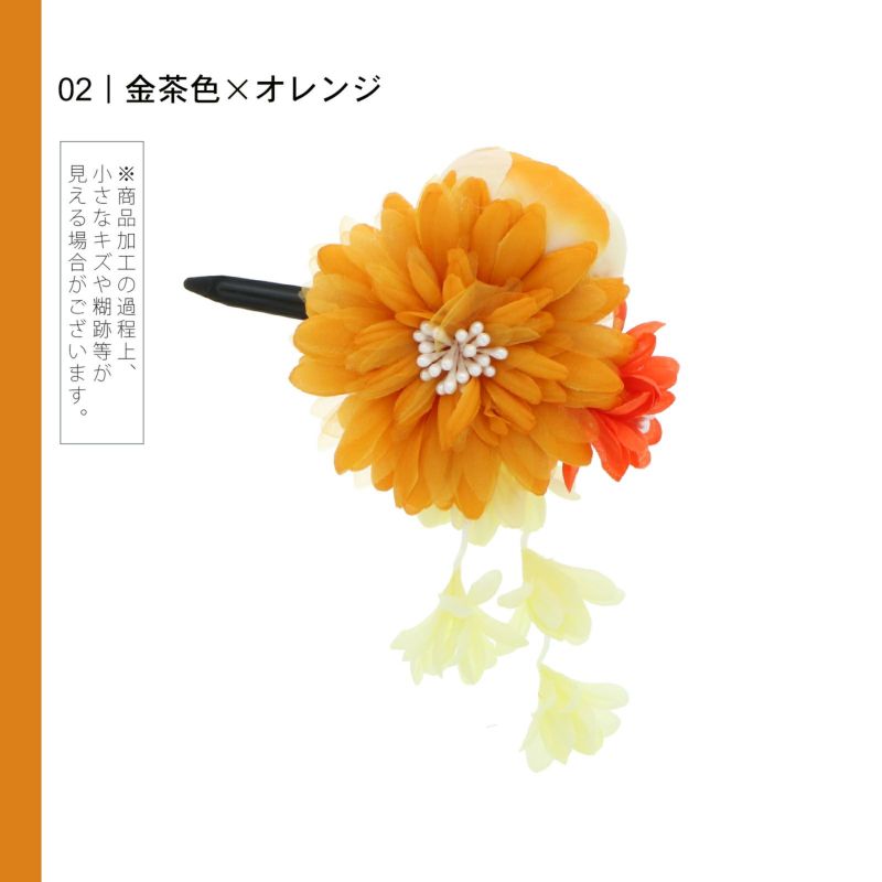 2金茶色×オレンジ:深い金茶色のお花、強いオレンジの小花、白のペップ。オフホワイトと浅いオレンジの花びらの玉ばら。クリームイエローの小花の房飾り。