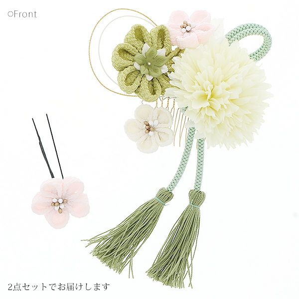 (卒業式応援75%SALE 2/19迄)【Prices down5】振袖髪飾り2点セット「グリーン お花とつまみのお花、房飾り」つまみ細工髪飾り 振袖髪飾り 華やか髪飾り コーム お花髪飾り (1758)【メール便不可】ss2512wkk25
