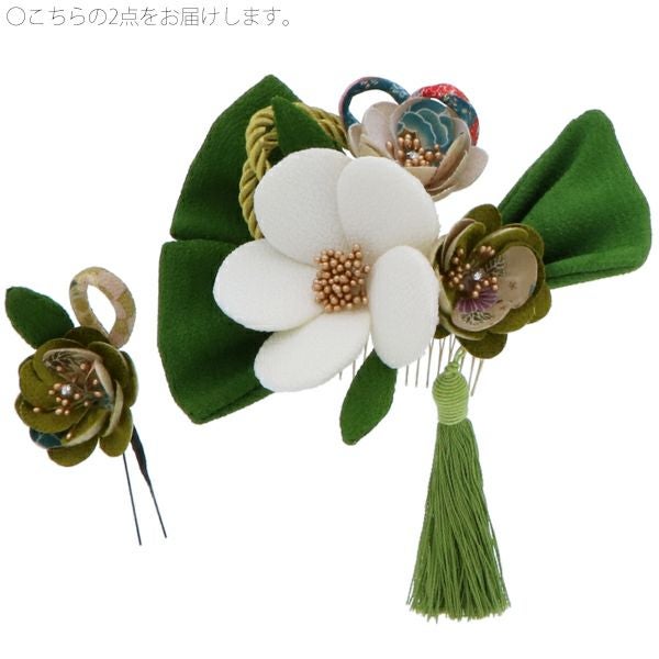 (卒業式応援75%SALE 2/19迄)振袖髪飾り2点セット「緑色のリボン、白色のお花、房飾り」振袖髪飾り 成人式、前撮り、結婚式の振袖に 十三詣り、卒業式の袴にも 袴髪飾り (No.51211)【メール便不可】<H>ss2512wkk10