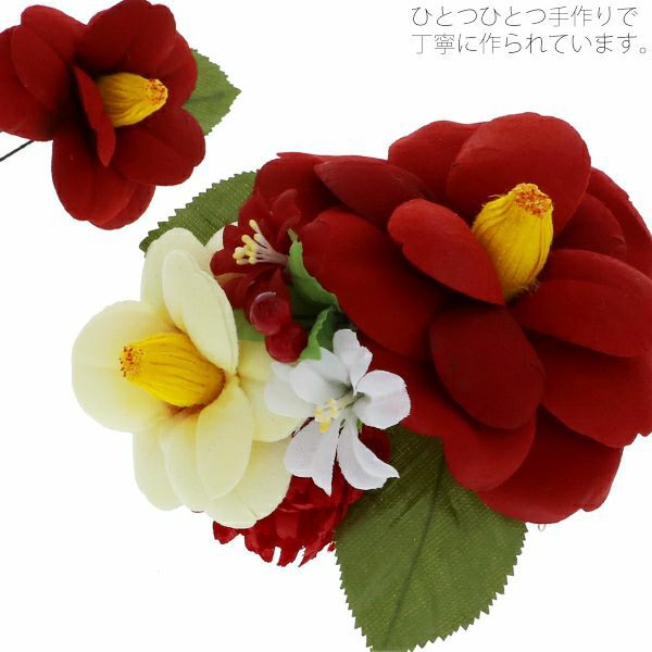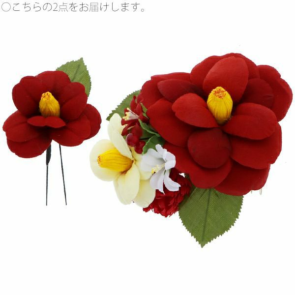 華やかな椿のお花のコーム、Uピンの髪飾り2点セットです。振袖などの華やかなお着物に合わせて、成人式、結婚式などの晴れやかな席に。