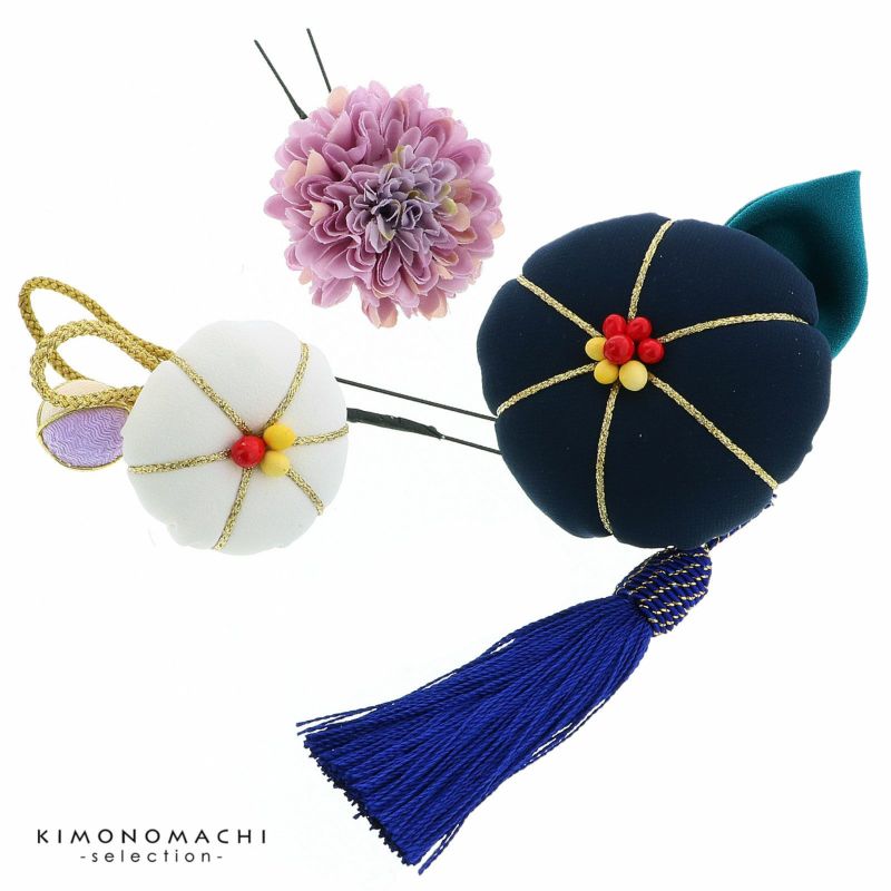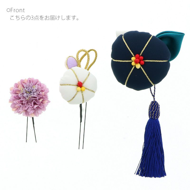 【カラー】ぽってりとした椿の花のような髪飾り。黒みの紺に金糸をかけたお花、青緑色と白のつまみの葉、冴えた青の房飾り。Uピンは白地に金糸のお花に薄紫と白の玉飾り、金の組紐。くすんだパープルの花。