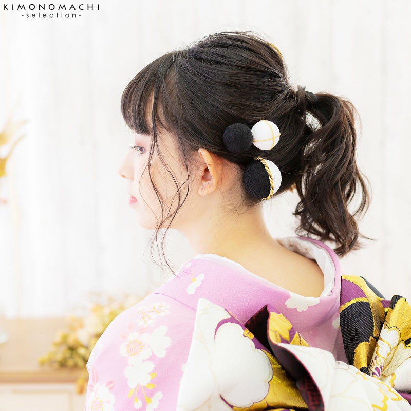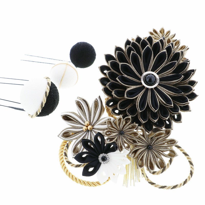 (卒業式応援75%SALE 2/19迄)髪飾り 成人式 花髪飾り コーム Uピン 4点セット 「剣菊と組紐、玉飾り 黒×白×ゴールド No.54929」 振袖用髪飾り お花髪飾り つまみ細工 成人式 卒業式 結婚式 着物 日本製 【メール便不可】<H>ss2512wkk10